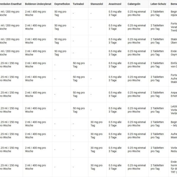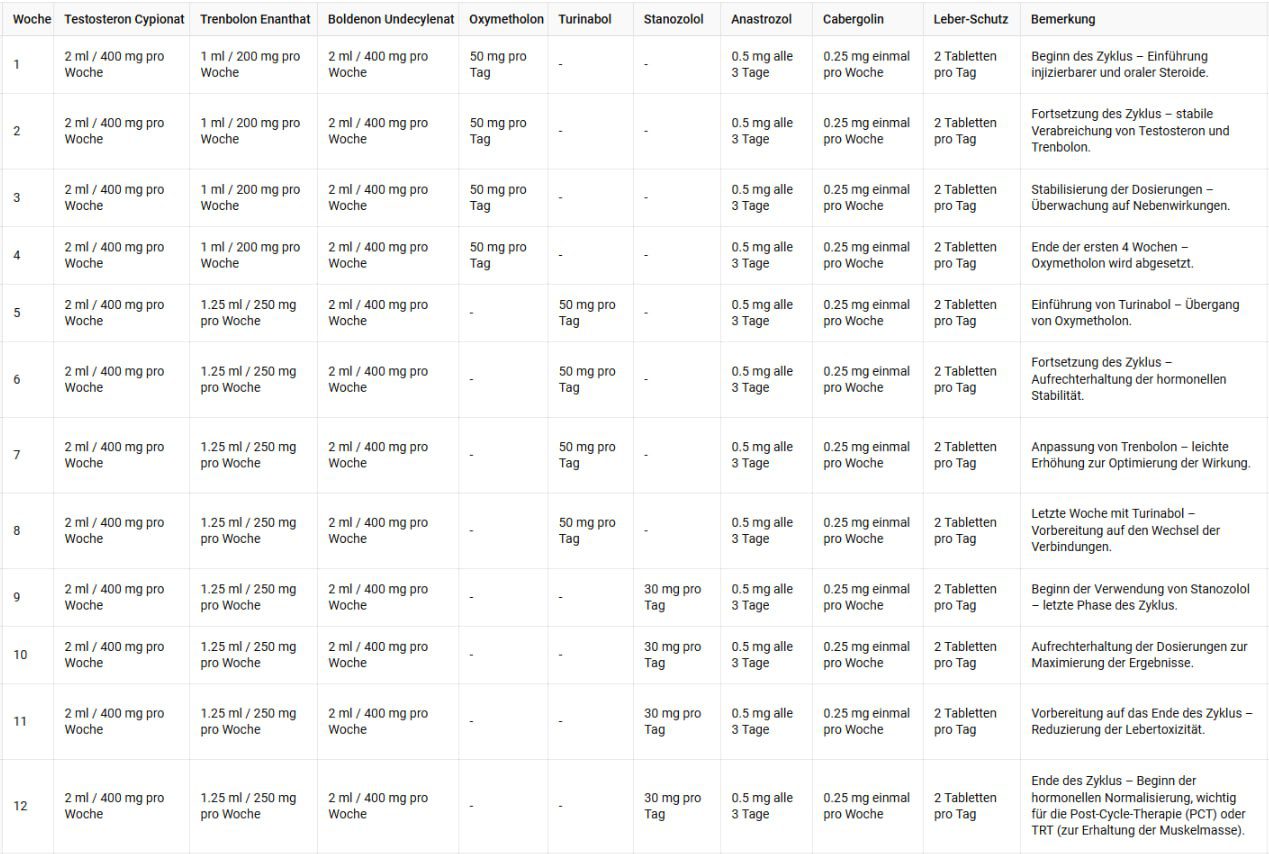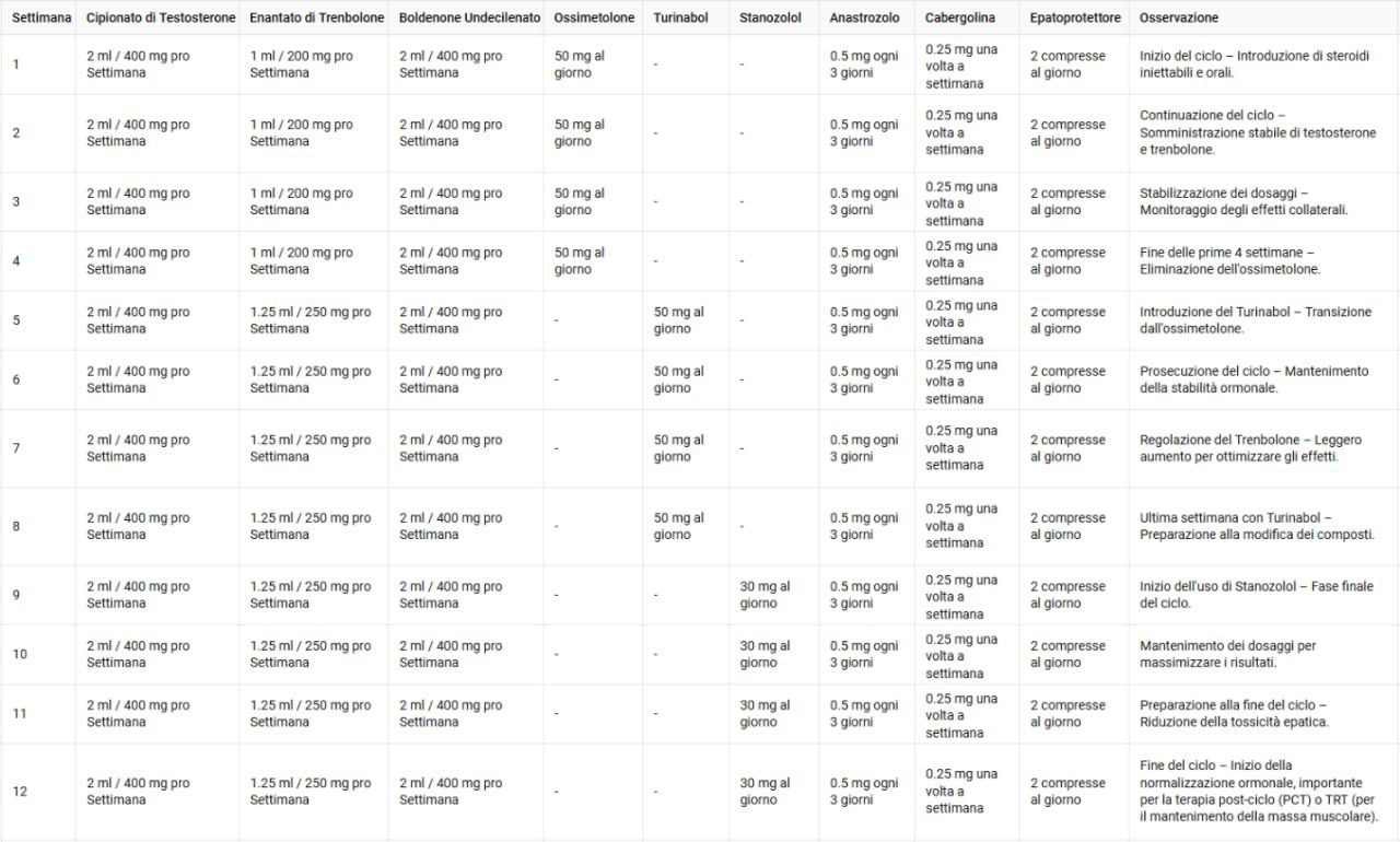 This cycle is designed for individuals with intermediate experience who want to develop high-quality muscle mass, increase strength, and maintain a defined and vascular physique. We combine Testosterone Cypionate, Trenbolone Enanthate, Boldenone, and oral steroids to ensure a balance between mass gain and muscle definition.